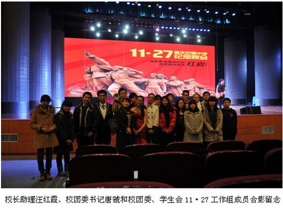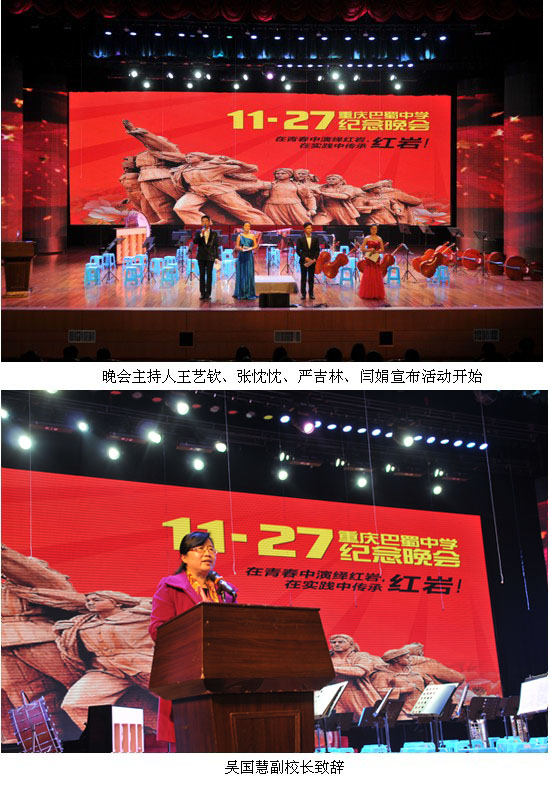 (巴蜀网 唐虢)红岩魂,沉淀历史的痕迹,我们用勇气传承弘扬。巴蜀情,积攒崛起的力量,我们用热情走向前方。11月27日下午五点,由重庆巴蜀中学校团委、重庆巴蜀中学学生会主办,各年级、社团协办的“信仰的力量——重庆巴蜀中学11•27主题纪念晚会”在鲁能巴蜀大礼堂隆重举行。重庆巴蜀中学校长王国华、党委书记张勇、副校长吴国慧、校长助理邓飞、校长助理汪红霞、鲁能巴蜀中学党总支书记付英等学校领导、各处室领导和各年级主任参加了本次活动。