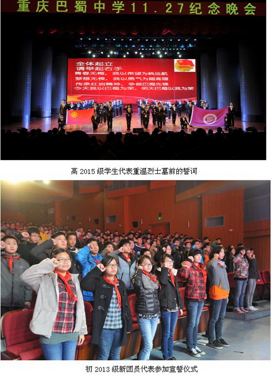 短片《誓言》回顾了11月18日校学生会和高一年级学生代表赴歌乐山烈士陵园扫墓的情景,“我宣誓:争做红岩精神,争做巴蜀先锋……”声声誓言字字铿锵,舞台上的团旗、校旗显得格外的鲜艳耀眼。初三年级新入团的三百二十名团员也参加了宣誓,“今天我以巴蜀为荣,明天巴蜀为荣”,相信他们必将把誓言铭刻于心而付诸于行。