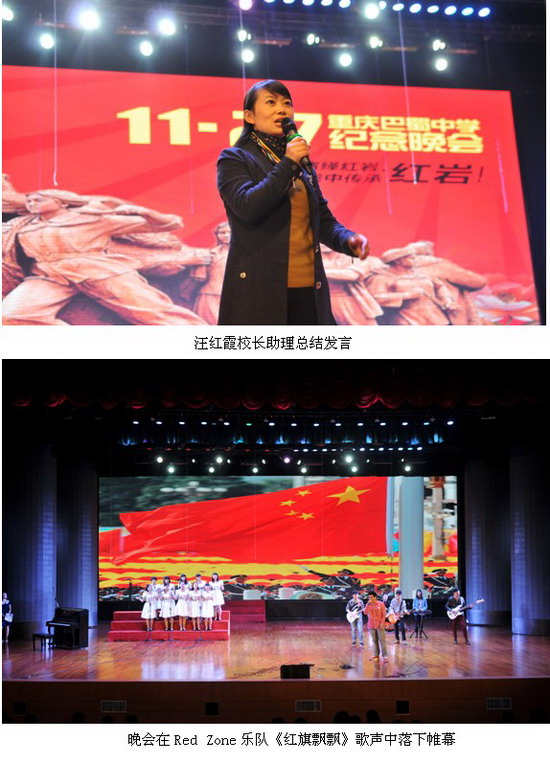 汪红霞校长助理做了总结发言,她对晚会组织策划人员的辛勤工作充分肯定,她希望大家能以本次活动为契机,学习、发扬、传承红岩先烈的革命精神,勤奋学习、乐观生活、积极工作,用热情与奋斗迎接一个又一个新的胜利,用青春与梦想迎接巴蜀中学八十周年华诞。