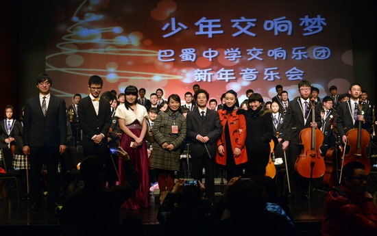 (巴蜀网 李加一 汪红霞)2013年的12月30日晚7:30,巴蜀中学管弦乐团在重庆大剧院成功举办“少年交响梦”新年音乐会,这是继去年在大剧院成功首演之后的又一精彩亮相和长足进步。音乐会座无虚席,乐团的小音乐家们以自己最佳的状态将一场别开生面的交响音乐会献给了在场所有的观众。