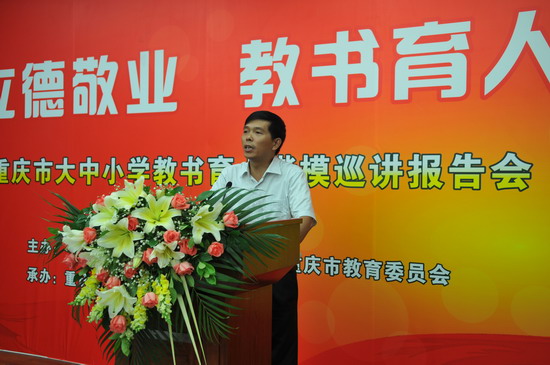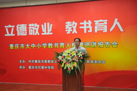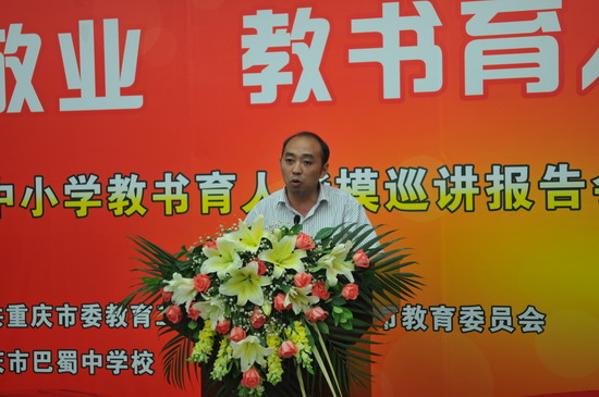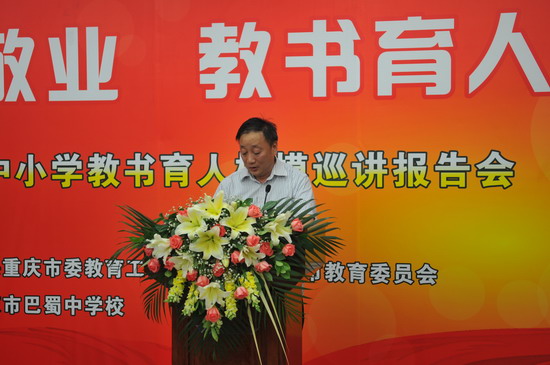 巴蜀中学党委书记、副校长张勇同志代表学校向本次巡讲活动的各位教书育人楷模的到来表示热烈的欢迎。“百年大计、教育为本;教育大计、教师为本”,教师队伍的建设,关系到学校发展的根本,关系到民族的未来和希望。巴蜀中学在近80年的办学历程中,一直秉承“公正诚朴”的校训,这与中华民族的传统美德是一脉相承的。学校将以此次活动为契机,在全校掀起学习、宣传师德先进,争当师德模范的热潮,并结合创先争优活动的开展,加强师风师德建设,引导广大教职工勤恳敬业,从自己做起、从身边做起、从小事做起,努力成为教书育人模范,办人民满意教育!