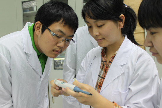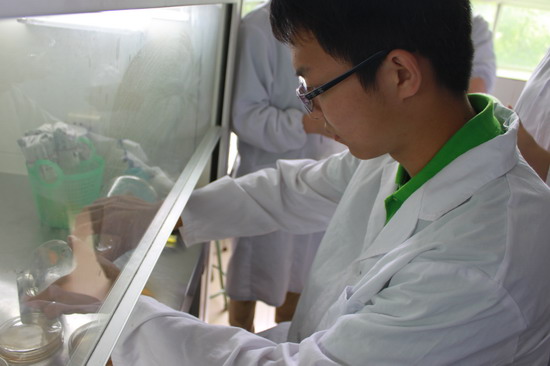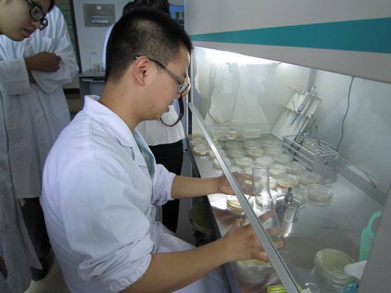 徐耀波老师热情的接待了同学们,还亲自为学生们讲解他们将用到的各种先进仪器的功能和具体使用方法。同学们感叹说:像离心机、恒温培养箱、无菌操作台等这些平时只听过没看过的仪器今天竟然可以使用这些仪器开展探究实验。乘着同学们火热的激情,季鑫、何鑫老师顺势引导学生在学习教材实验原理的基础上提出更深入的问题进行探究。同学们以实验小组的形式开展了具体实验探索,在老师们的鼓励和指导下纷纷提出自己的研究课题,探讨如果改变酵母菌的生长环境其种群数量将如何变化。实验就在热烈的气氛中进行了五个小时,同学们都已达到了废寝忘食的程度。实验的具体操作完成后,要得到实验结果还需让酵母菌生长七天,同学们带着留恋和期待离开了实验室,回到学校。