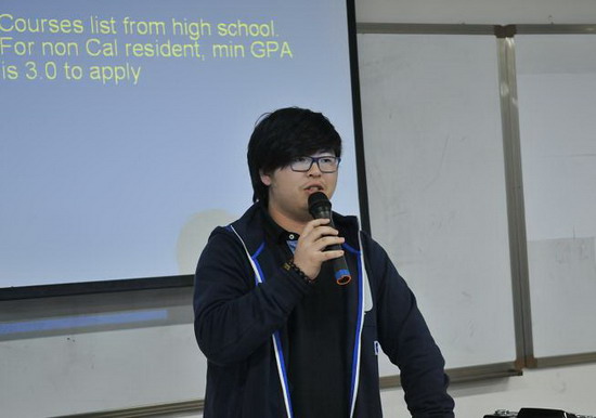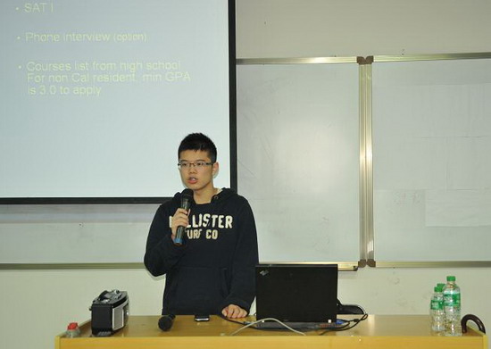会上,Brenda向在座的学生和家长宣讲了该校的招生时间、条件等政策,会上,学生和家长们也踊跃的提问,就自己或者孩子在申请过程中遇到的问题以及怎样在众多申请中脱颖而出一一进行了咨询。随后,于2012年暑假参加了该校暑期课程的两位国际班学生李彦甫、刘又铭和大家分享了他们8周的学习和生活经历。作为国内高一年级的学生,两名同学插班到伯克利的大学课堂,顺利的完成了学习并拿到了伯克利本科阶段的8个学分。