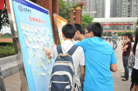 “你对那些吸烟者,特别是在校园里吸烟的人,有什么看法?有什么话要对他们说吗?”控烟卫士向过往同学进行了现场调查。在了解了吸烟的一系列危害以后,很多同学主动的拿起了笔,把自己对吸烟者的话写了下来,张贴在调查结果展示栏里。“吸烟有害健康,请不要吸烟。”“在学校里吸烟既不帅也不成熟,不要拿自己的健康开玩笑。”“吸烟危害自己也影响他人。”“吸烟是无能者逃避现实的最好方法。”一条条调查结果显示了同学们对吸烟行为的态度和抵制决心。