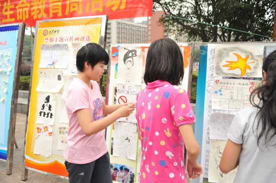 下午4点50,随着下课铃声的响起,我们的活动正式拉开序幕。一块块写满禁烟知识的展板,一幅幅由本校同学自行设计的禁烟宣传画,加上不断播放的公益短片,吸引了过往同学纷纷驻足观看。“啊,你看吸烟者的肺,好可怕!”一位看展板的同学对她的同伴说。守候在一旁的控烟卫士立刻为他们讲解以来:“对,吸烟者的肺会被各种有害物质所侵害,但是吸烟所损害的还不止是他们的肺……”精彩的讲解吸引来了更多的听众。