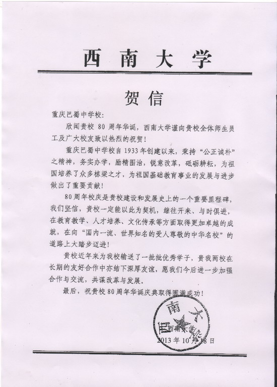 重庆市巴蜀中学校 办公室电话:023-63002371 招生咨询电话:023-63002629 学校地址:重庆市渝中区北区路51号 邮编:400013