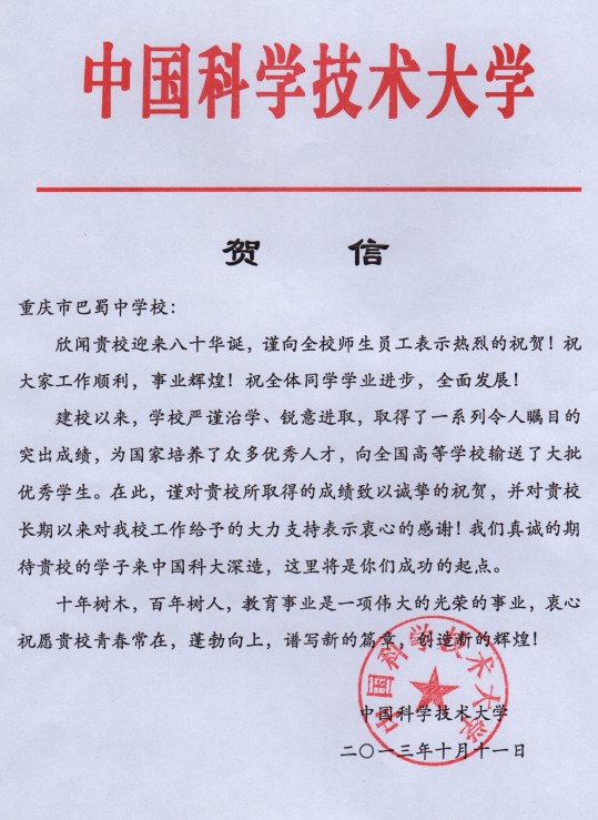 中国科学技术大学致巴蜀建校80周年贺信