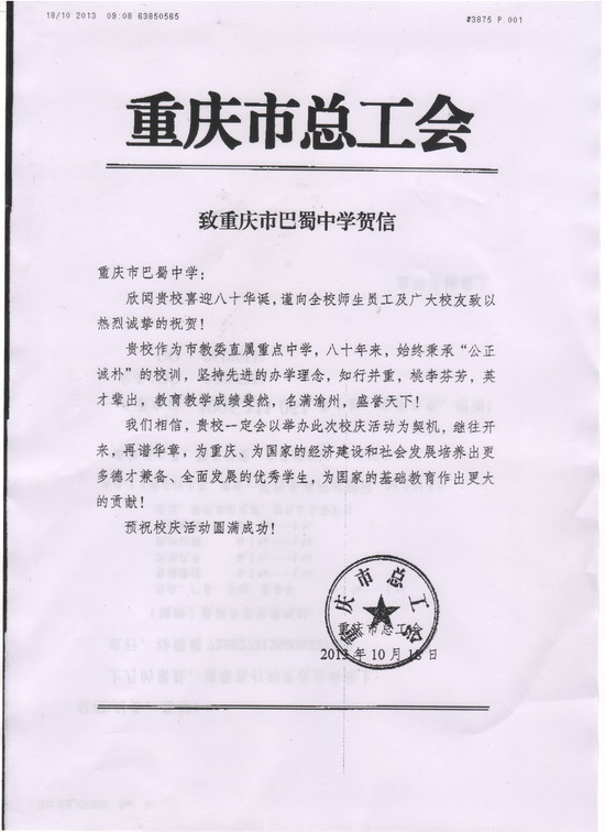 重庆市总工会致巴蜀建校80周年贺信