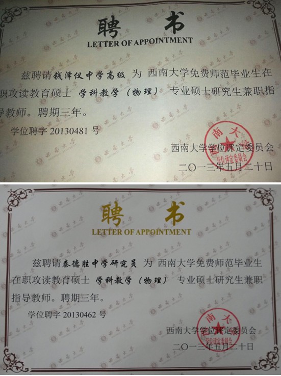我校钱泽仪、秦德胜两位老师被聘为西南大学免费师范毕业生在职攻读教育硕士物理专业硕士研究生兼职指导教师。