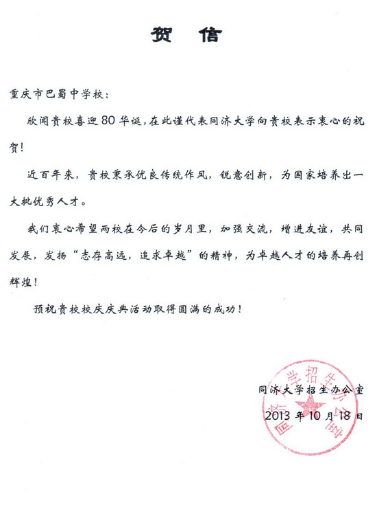 同济大学致巴蜀建校80周年贺信