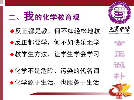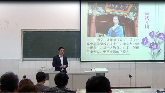 在近三个小时的讲座中,田老师从个人的化学教育观说起,讲述了教学设计、教学方式、教学过程、教学语言等细节打磨和个人教学设计中的一些感悟,最后分享了自己十多年在课堂教学中的一些处理技巧和特色。整个讲座赢得了青海省学员的高度肯定,也赢得西南大学化学化工学院领导的充分肯定。西南大学化学化工学院希望今后多与重庆巴蜀中学化学教研室加强交流合作,共同为化学学科教育做出一些大胆的探索和有益的尝试,为化学教师进修培养创造更多途径和机会。