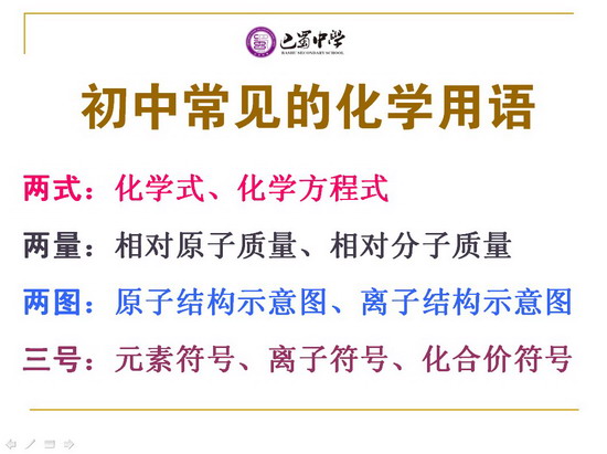 化学用语是初中化学启蒙学习的重难点,其内容零散,课题分散,专业性强,趣味性差。化学用语的学习困难让很多学生知难而退,化学用语的教学难题困惑着很多教师。针对这些情况,田老师采用分散难度、强化体系,丰富趣味,落实过手等措施来解决化学用语的教学难题。把知识整理归纳为:(1)两式:化学式、化学方程式。(2)两量:相对原子质量、相对分子质量。(3)两图:原子结构示意图、离子结构示意图。(4)三号:元素符号、离子符号、化合价符号。这种处理方法使内容清晰、思路简洁,易学易记。