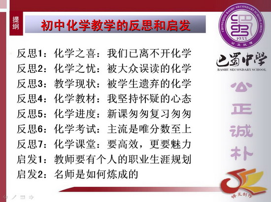 此时正值寒假,全区初中化学教师全部参与,高度重视这次交流学习。田博文老师从反思和启发两个层面,结合自己的教学实际,反思了化学之喜、化学之忧、教学现状、化学教材、化学进度、化学考试和化学课堂七个方面。然后结合个人成长分享这些年的启发,一是叮嘱年轻教师要有个人的职业生涯规划,二是名师是如何炼成的。最后分享了自己的梦想就是做一名敢想敢做、勤奋求实、开拓创新的巴蜀人。